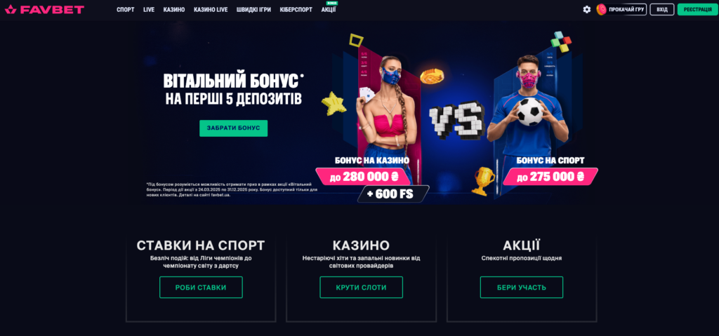 Букмекерська контора Favbet – це надійний партнер для любителів ставок на спорт в Україні, який поєднує широкий вибір подій, високі коефіцієнти та щедрі бонуси. Легальна діяльність з ліцензією КРАІЛ, зручний інтерфейс і швидкі виплати роблять БК Фавбет ідеальним вибором як для новачків, так і для досвідчених бетторів. Любиш спорт і хочеш додати азарту? Приєднуйся до Фавбет юа прямо зараз, роби ставки на улюблені команди та вигравай разом із професіоналами!